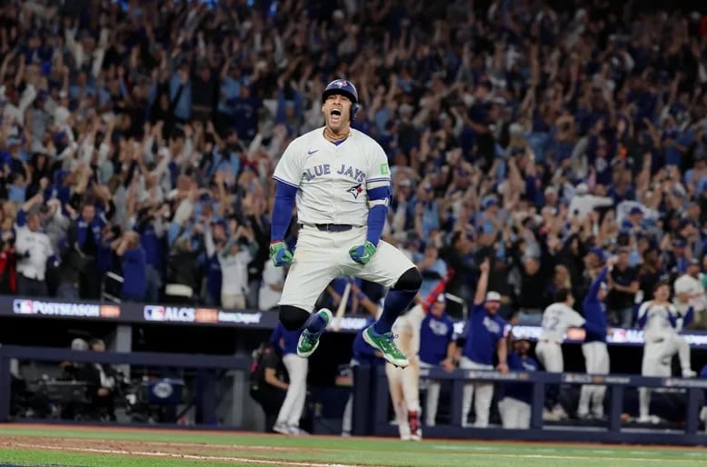 Blue Jays designated hitter George Springer celebrates hitting a go-ahead home run in Game 7 of the American League Championship Series, sending Toronto to their first World Series since 1993.