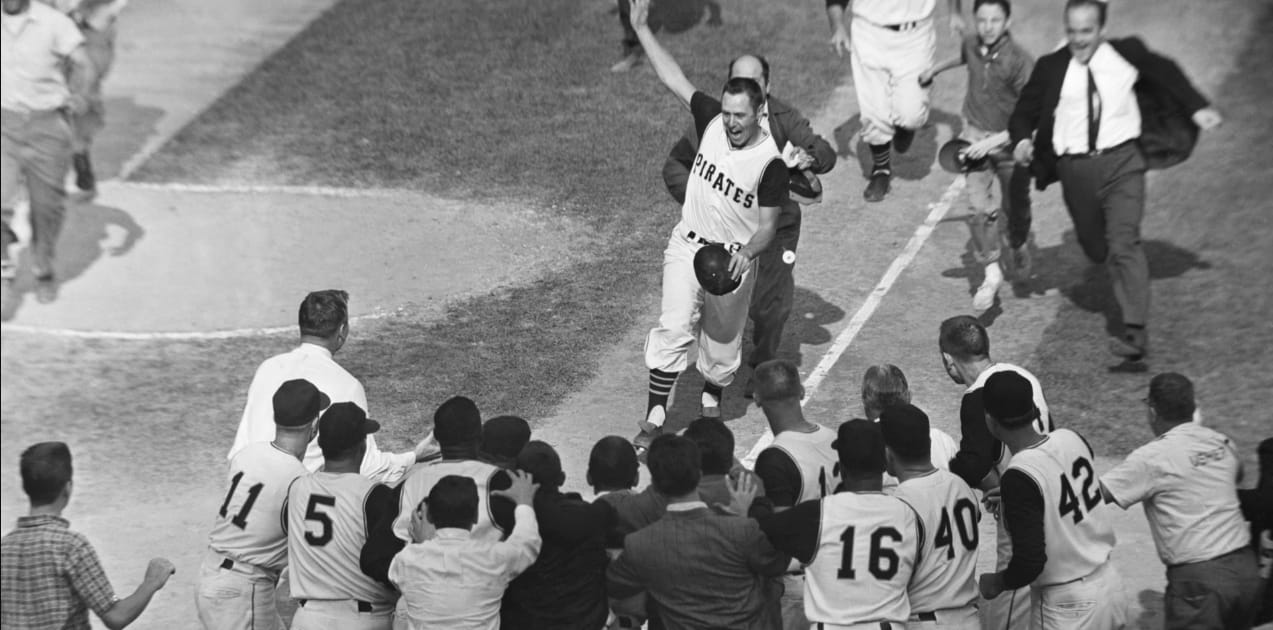 Pittsburgh Pirates second baseman Bill Mazeroski rounds the bases after hitting the game- and Series-winning home run in Game 7 of the 1960 World Series against the New York Yankees.
